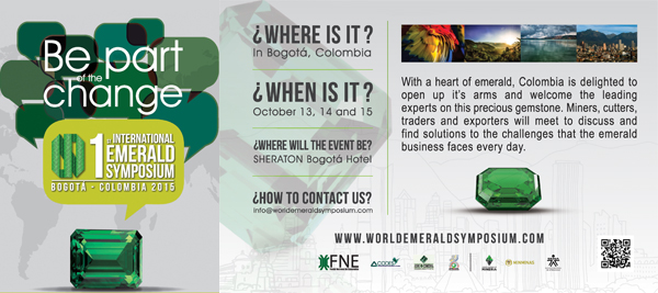 First International Emerald Symposium: October 13–15, 2015Details are forthcoming regarding this symposium, sponsored by Fedesmeraldas, the Federación Nacional de Esmeraldas de Colombia. It will be held in Bogotá at the Sheraton Bogotá Hotel. Visitors to the symposium website can sign up for more information.